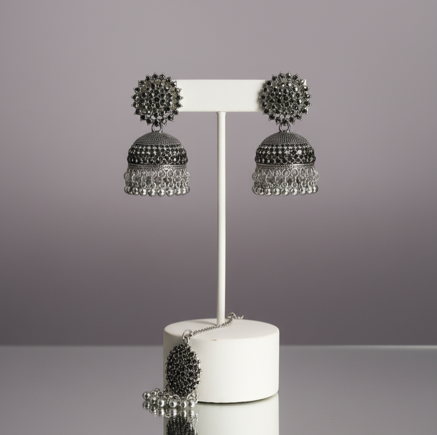 Afghani Oxidized Silver Black Stone Jhumka & Maang Tikka Set
