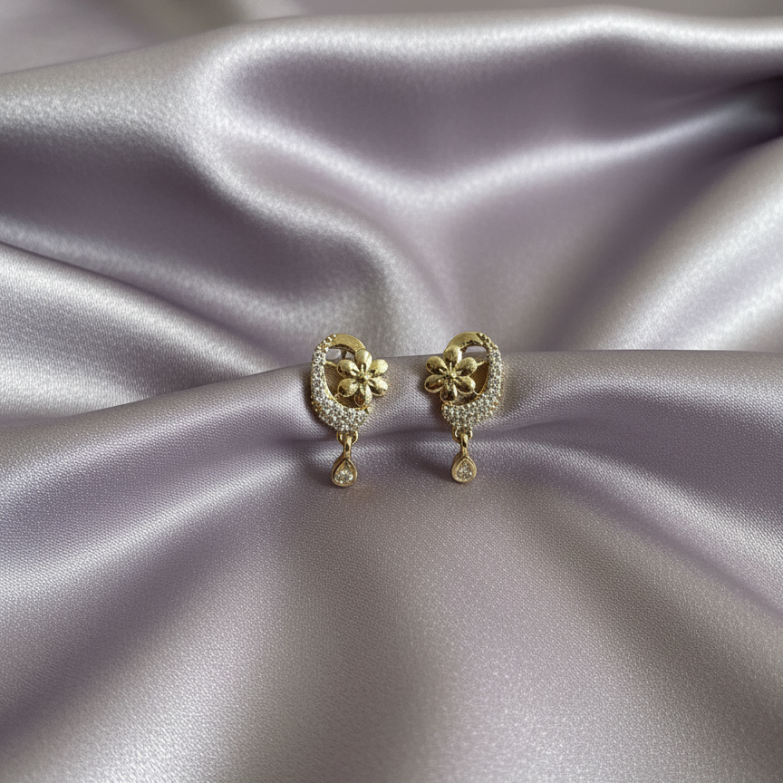 Make a bold, contemporary statement with these unique geometric dangle earrings. The stud is defined by an abstract, angular starburst or kite-like pattern, completely paved with brilliant clear zircon stones. This modern structure is balanced by a traditional gold drop, culminating in a shimmering zircon teardrop. They combine cutting-edge style and classic sparkle for a truly distinctive, fashionable look.