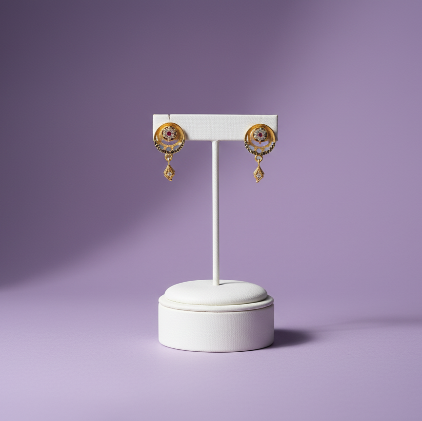 Design: Crescent Stud with Red Halo Center and Drop Dangle